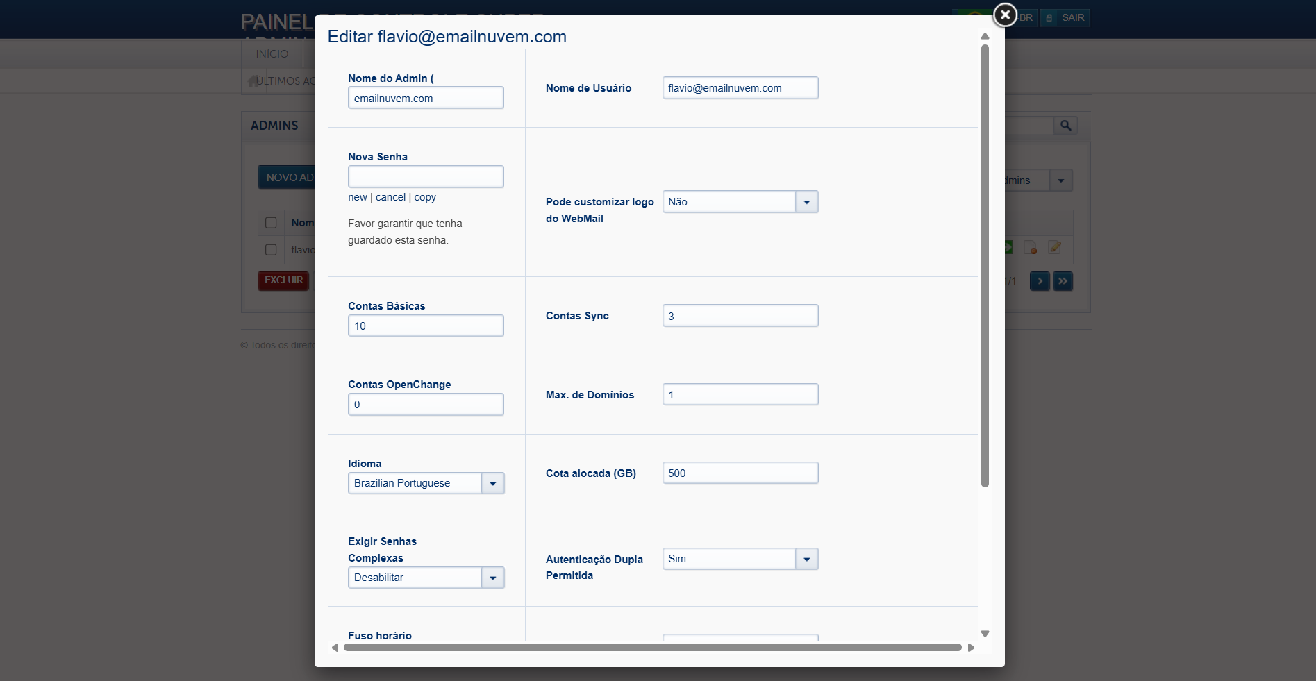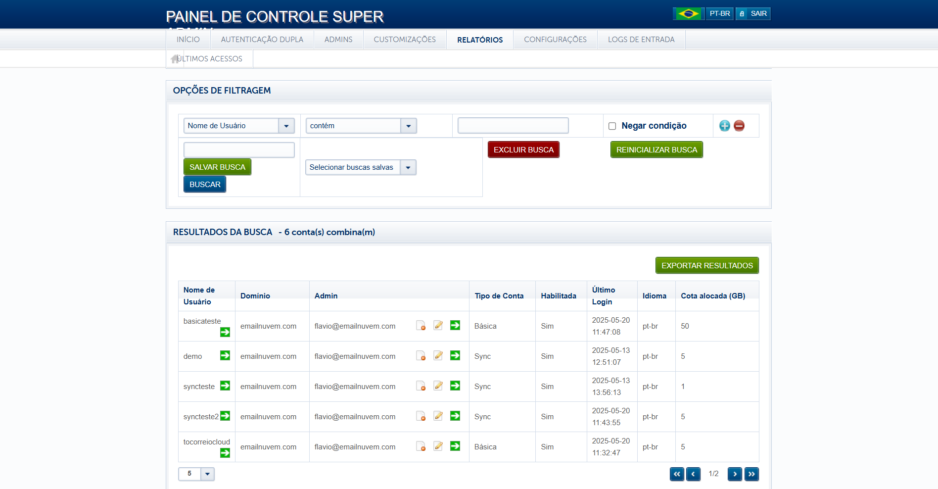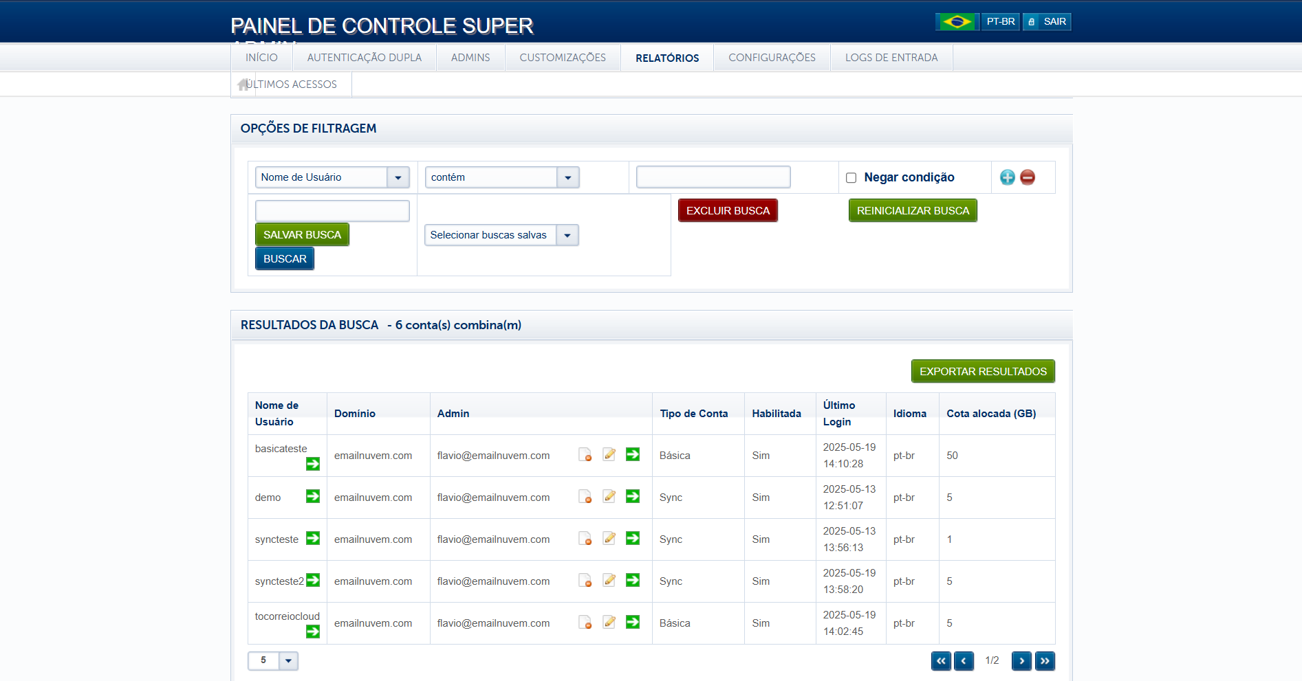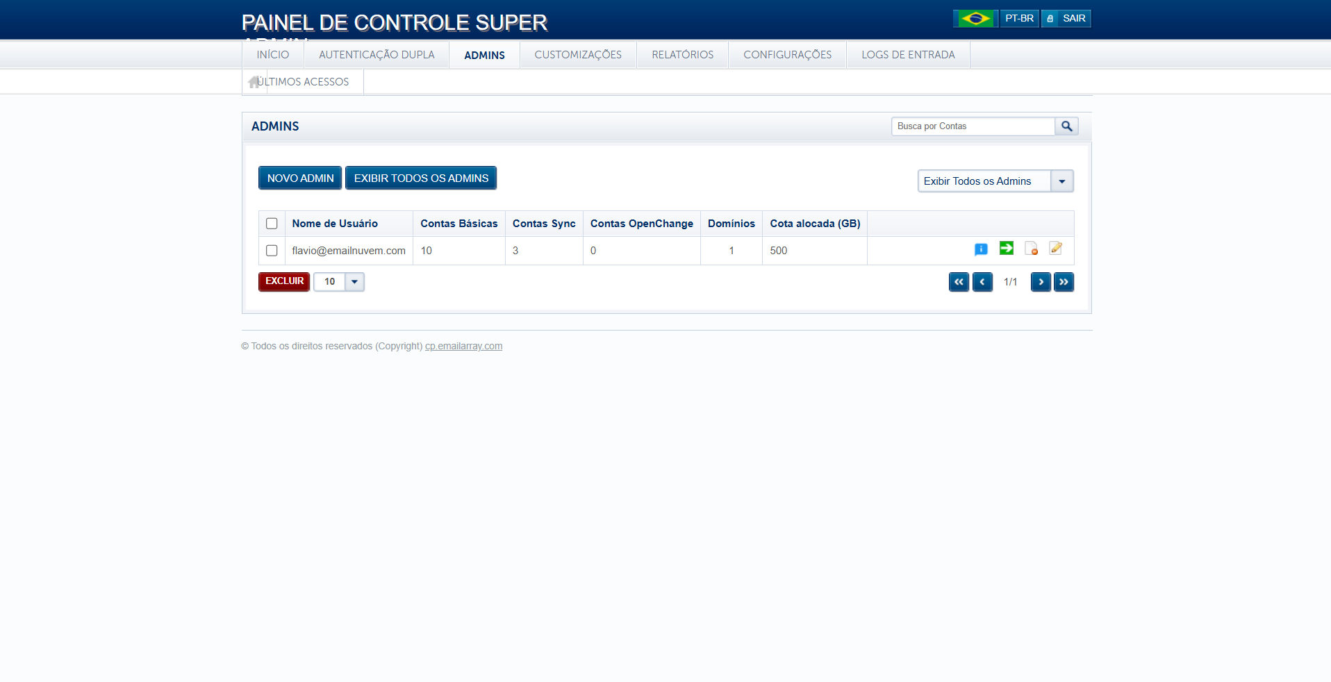 Nosso painel fornece uma série de recursos diferenciados, como definição de cota diferenciada para cada conta, definição de apelidos das contas, listas de distribuição protegidas por senha e permissão de envio, listas negra e branca a nível de domínio e de usuário, regras, rastreio dos e-mails enviado, auditoria de e-mails, administradores adicionais para acesso aos painéis com permissões diferenciadas e serviço extra de customização do Webmail com logo na tela de login e após logado.